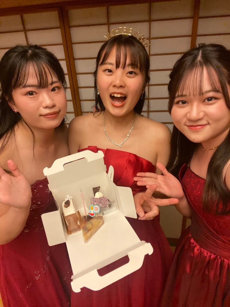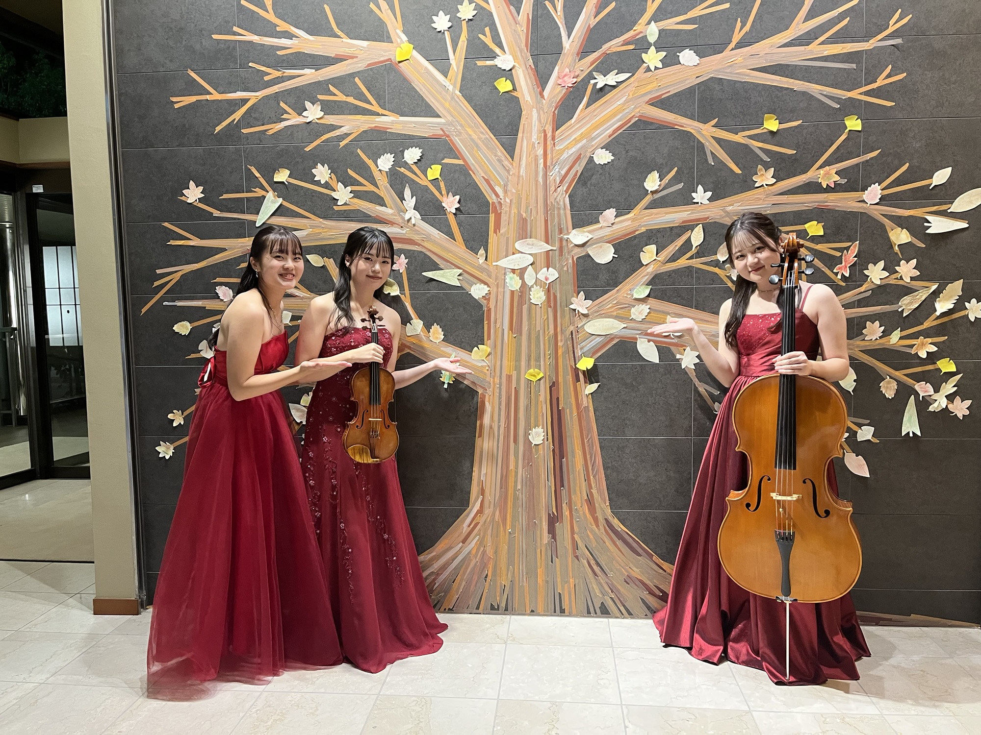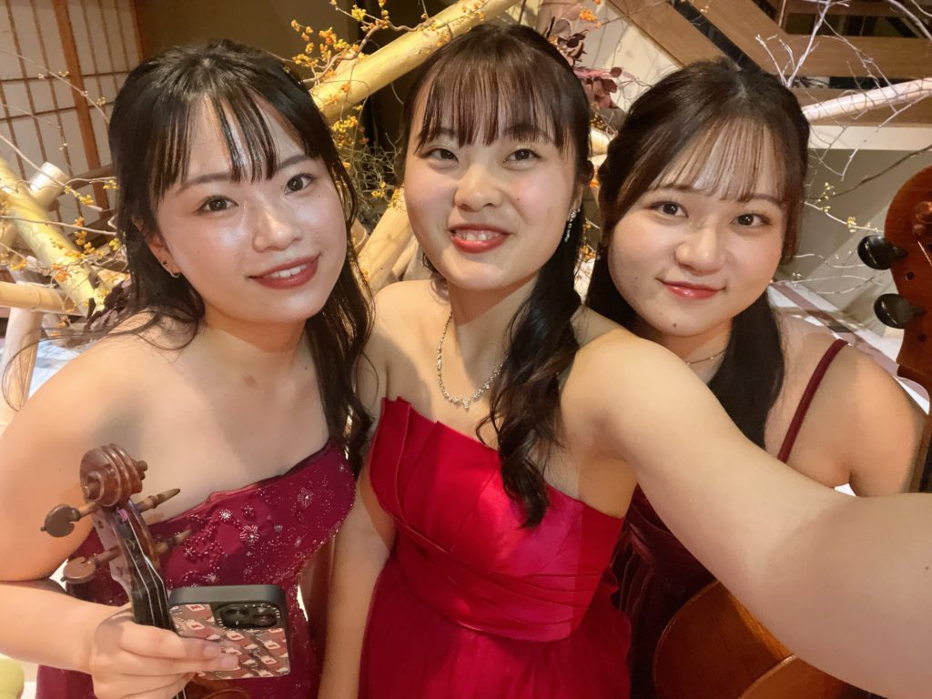ナイトバーラウンジ終演🍁 2024.11.05 11.4 鐘山苑 ラウンジコンサート💐 大学の同期2人とトリオコンサートという形で演奏しました✨ 今回は満員御礼で、多くのお客様にお越しいただきとても嬉しかったです! 秋ならではの曲をはじめ、名作映画の音楽やクラシック音楽など幅広いプログラムでお届けしました!ドレスは秋らしく3人で赤色を👗👧🏻 そして終演後に2人が誕生日のお祝いをしてくれました🥂 次回は11月6日・7日に声楽とお邪魔します! 終演後にパシャリ! 幸せです…🍰
