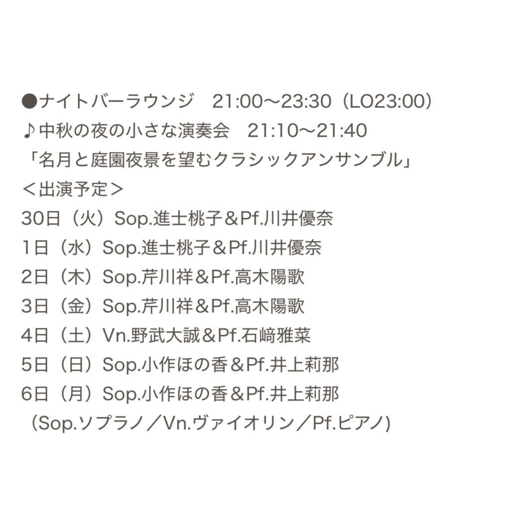 鐘山苑 お月見祭り出演のお知らせ🎑 2025.09.14 ご無沙汰しております!!!投稿が滞ってしまいましたが、生きております😌 久しぶりのお知らせになります! 鐘山苑🎑中秋の夜の小さな演奏会に出演します。 10月2.3日の計2日間お邪魔させていただきます! 実はお月見祭りでの演奏は初めて。秋やお月様にちなんだ楽曲を沢山ご用意しております🌙 今回は久しぶりの声楽とピアノのデュオになります。是非素敵なひと時をお過ごしになりませんか?🥂