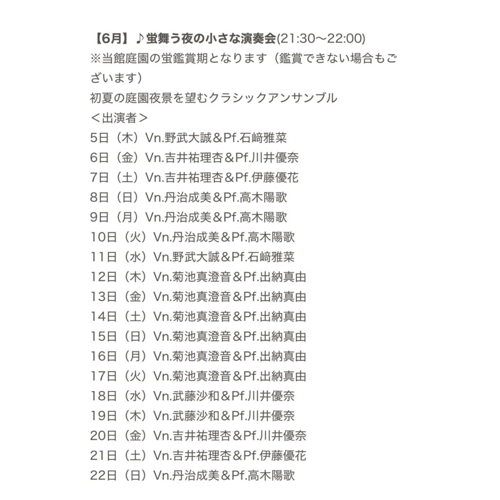 蛍舞う夜の小さな演奏会に出演します。